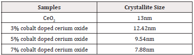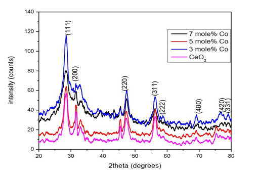 However, a minor reduction in size was observed with the incremental increase in cobalt doping concentration, denoted at 3, 5, and 7 moles %. A gradual peak shift towards lower angle side in the (111) plane was observed. This diminution in size was attributed to the substitution of smaller Co2+ ions having radii of 0.74Å in place of larger Ce4+ ions having atomic radii of 1.30Å within the CeO2 crystal lattice [31]. This decrease in particle size lead to peak broadening [32,33]. The crystalline sizes or average particles sizes were calculated using Debye-Scherer’s formula and their sizes were found to be lie in the range 7–13 nm that is in accordance with prior literature [34]. The calculated crystalline sizes are given in (Table 1) (Figure 1).