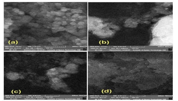 Scanning electron microscopy was done for examining morphology of as prepared samples of Ceria nano particles. A suitable scale of 500nm was chosen in order to get a clear picture of effect of doping on ceria nano powders. The obtained SEM micrographs exposed the spherical and agglomerated nature of nanoparticles. It was observed from (Figures 3) that the morphology of the nanoparticles exhibited variation depending on the doping percentage of the dopant. With the increase in doping concentration the sizes of the Nano particles decreased and agglomeration increases. It is also clear from the SEM images of synthesized cobalt doped CeO2 samples were porous in nature (Figure 3).
