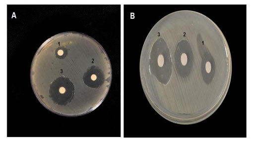 The antimicrobial efficacy of various synthesized combinations was assessed using the disc diffusion method against resistant strains of E. coli and S. aureus. In this study, three compounds were investigated, and the nano composite with a 7 mole % doping concentration exhibited the highest efficiency, characterized by a zone of inhibition measuring 23mm ±0.67, as detailed in (Tables 2,3). The observed zones of inhibition and their corresponding antibacterial activity patterns suggest the potential of these compounds as alternative therapeutic agents against challenging infections that pose difficulties for current treatment strategies. (Figure 4) illustrates the antibacterial activity of pure cerium oxide nanoparticles against both selected pathogens, while (Figure 5) depicts the impact of the three doped materials on determining effective antibacterial activity (Figure 4) (Figure 5) (Table 2).
