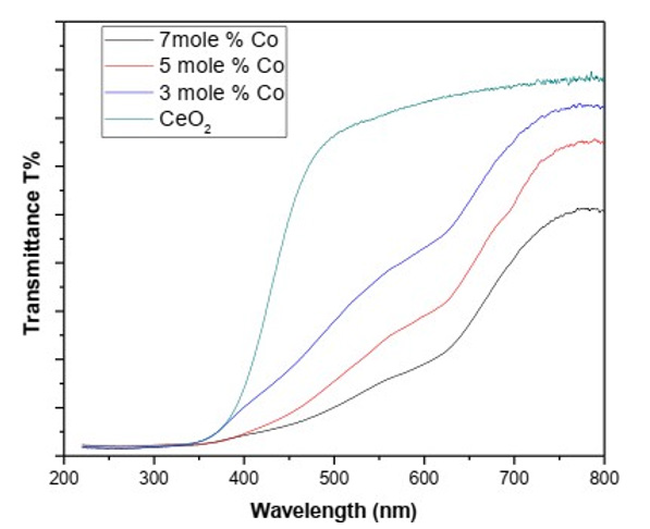 Diffuse reflectance spectroscopy was performed to measure optical properties including reflectance, transmittance and band gap. Reflectance spectra of all samples of cerium oxide with pure cerium oxide and different doping concentration of cobalt were investigated in the wavelength from 220nm to 800nm at room temperature. UV–Vis transmittance spectra of pure ceria nanoparticles and different concentrations of cobalt-doped cerium nanoparticles is shown in (Figure 6) spectrum analysis showed a decrease in transmittance in visible region by increasing dopant concentration. These results recommended that the transmittance depends on the particle dimensions and the combinations of the particles [38]. This property of ceria nanoparticles can be utilized as UV shield due to increase of UV light absorption and visible light transmittance property [39] (Table 3) (Figure 6).