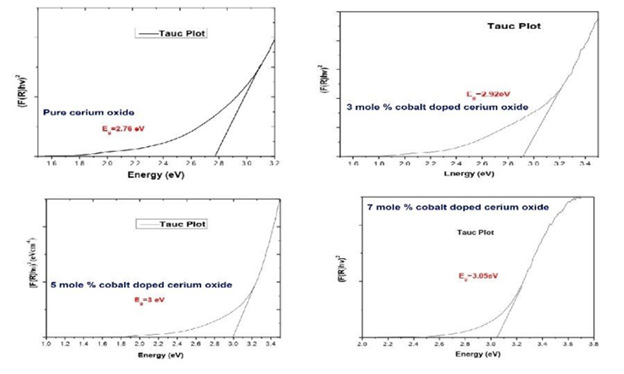 where h is Planck constant, F(R) is the absorption coefficient, Eg represents band gap and A represent proportionality constant. The exponent n represents the nature of electronic transition. Direct or indirect transitions can be obtained by substituting different values of n. For direct transition n is substituted as 2 and for indirect transitions n is equal to ½. In order to do this the value of the optical band gap was obtained by linearly extrapolating the linear portion to y=0. The function of (F(R)hν)2 vs photon energy for cerium oxide with different concentration of cobalt is given in (Figure 7) The estimated optical band gap of ceria nanoparticles was found to be 2.76eV with different concentrations of cobalt (i.e. 0.03 mole%, 0.05 mole %, 0.07 mole %) was found to be 2.92eV, 3eV, 3.05eV respectively (Figure 7). The band gap values clearly indicate the rise of band gap which can be explained as the captivity of electrons and holes in between valence and conduction band with decrease in particle size [42,43] (Figure 7).
