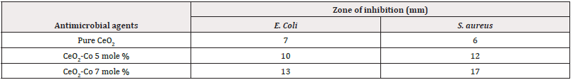In this research, the antibacterial properties of E. coli and S. aureus are studied thoroughly. E. coli is a gram-negative bacterium that causes diarrheal sickness, whereas S. aureus is a gram-positive bacterium associated with skin and tissue infections. Recent research has shown that cerium oxide is effective in fighting these two bacteria [28,29]. Research conducted by Y.A. Syed prompt us to investigate 3wt%, 5wt% and 7wt% cobalt doped cerium oxide synthesized via co precipitation instead of hydrothermal synthesis to study the antibacterial activities of E. coli and S. aureus [30].