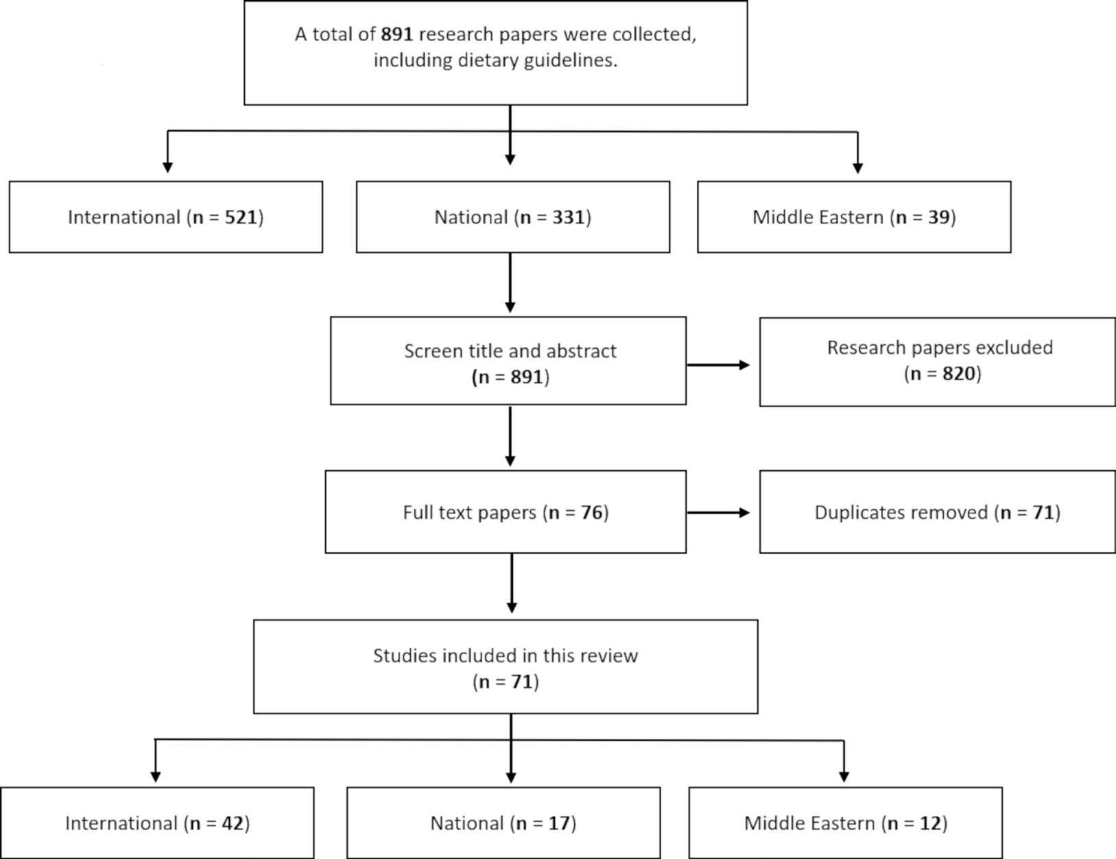 In this a narrative review for 71 dietary guidelines and articles (35 dietary guidelines and 36 articles) published until 2020. Dietary guidelines and articles were identified in the PubMed, Google Scholar, and Google Engine databases through dual-language (English and Arabic) searches of three keywords: “Food-based dietary guidelines for Saudi Arabia,” “Food-based dietary guidelines,” and “Dietary guidelines.” This review focuses on national, Middle Eastern, and international FBDGs and reviewed articles that included FBDGs for adults aged 18–65 years. The exclusion criteria were any articles that included FBDGs on specific target groups, such as pregnant women and individuals with chronic diseases, as well as those that included FBDGs for patients aged <18 and >65 years (Figure 1).