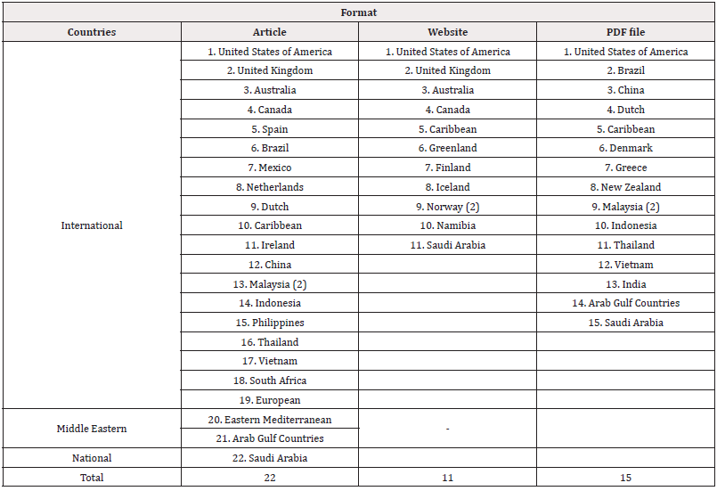 (Table 2) summarizes the data collected on FBDGs worldwide. The majority of references on FBDGs were collected from articles published by various countries (n = 22) regarding their guidelines. Some countries published these guidelines in articles, on websites, or as PDF files. Additionally, some countries, such as the United States of America, the Caribbean countries, and SA, published guidelines in three forms (articles, websites, and PDF files), whereas other countries, such as Malaysia, published multiple versions of the guidelines from the same source (articles and PDF files), and Norway published two versions on the Nordic Council of Ministers website.