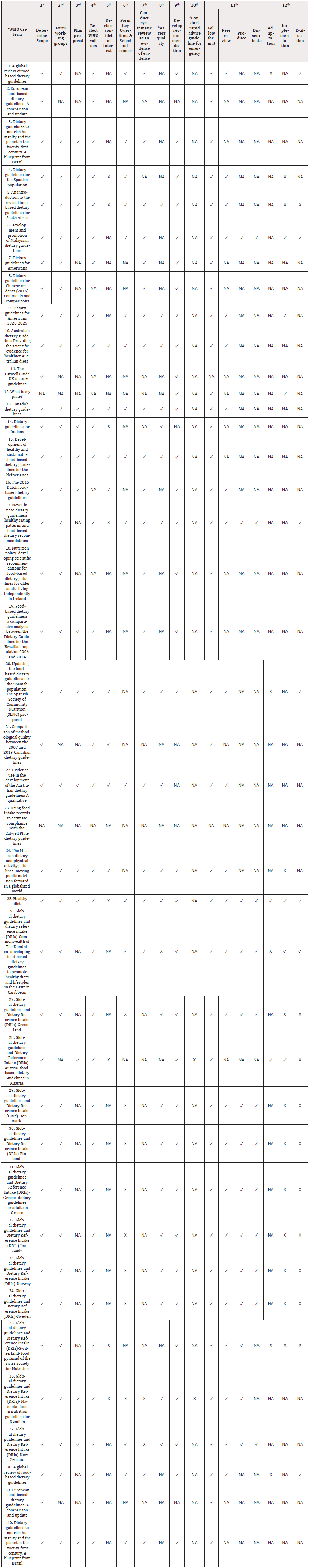 The WHO Handbook for Guideline Development (2nd edition; 2014) outlines the critical steps involved in guideline development that include the identification of the scope and purpose of the guideline; conducting systematic reviews of the evidence; formulating evidence-based recommendations; and adapting, implementing, and evaluating the guideline [8]. After reviewing the key steps, 12 criteria were summarized and used to establish dietary guidelines. (Table 3) compares the country-wise adherence to the WHO-recommended Twelve Criteria for Establishing Dietary Guidelines.