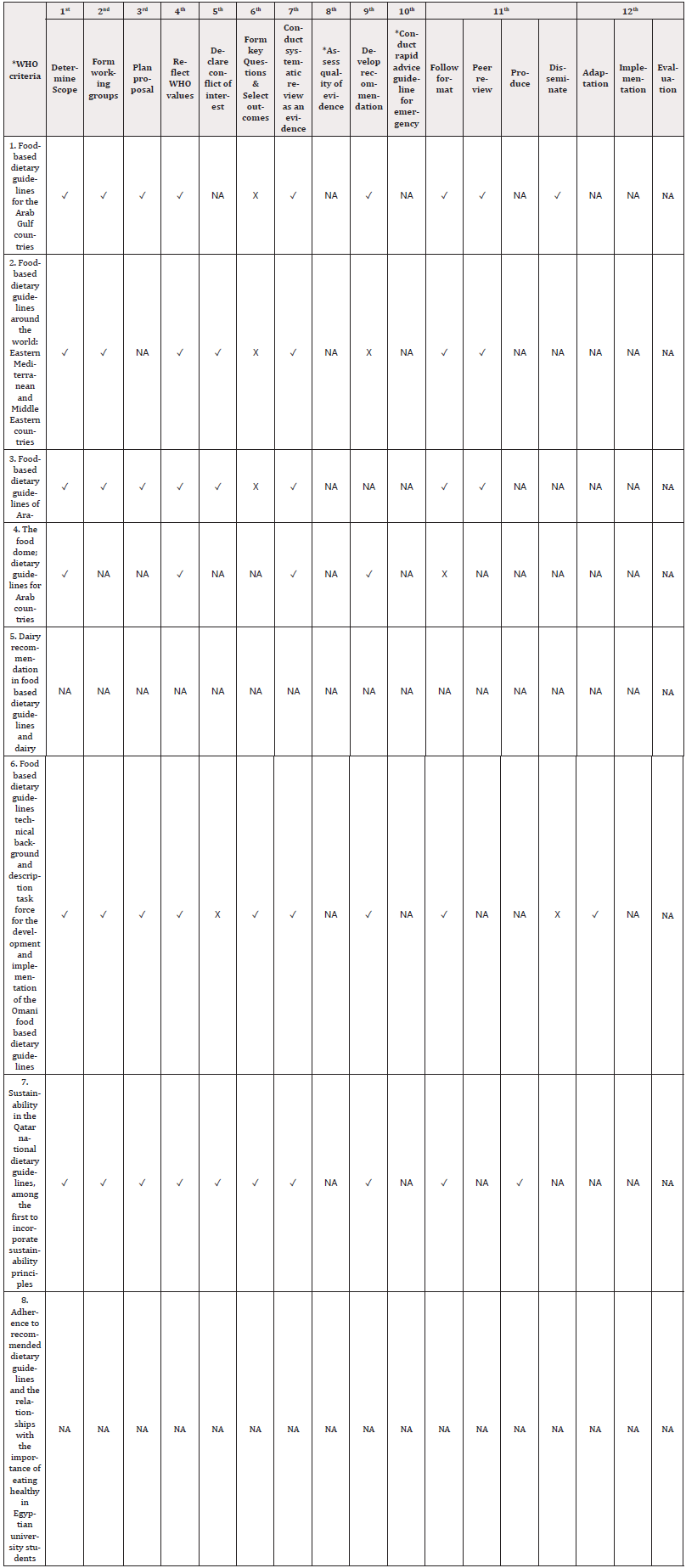 Table 4 displays the dietary guidelines for Middle Eastern countries and indicates whether they align with the WHO criteria. In terms of sustainability, the “sustainability in the Qatar national dietary guidelines, among the first to incorporate sustainability principles” was the first FBDG to incorporate sustainability principles, in addition to being the most adherent to the WHO criteria (10 out of 12). Furthermore, the “Food-based Dietary Guidelines of Arabic- speaking Countries: A Culturally Congruent Profile” and “Food- Based Dietary Guidelines Technical Background and Description Task Force for the Development and Implementation of the Omani Food-Based Dietary Guidelines” were the second most compliant guidelines that implemented the WHO criteria. All FBDGs in Middle Eastern countries did not apply or have any available information regarding the four key criteria: “Assess the quality of evidence,” “Conduct rapid advice guideline for an emergency,” “Implementation,” and “Evaluation.” The “Adherence to Recommended Dietary Guidelines and the Relationships with the Importance of Eating Healthy in Egyptian University Students” and “Dairy Recommendation in Food-based Dietary Guidelines and Dairy” guidelines had no information available about the whole criteria that were applied to either FBDG.