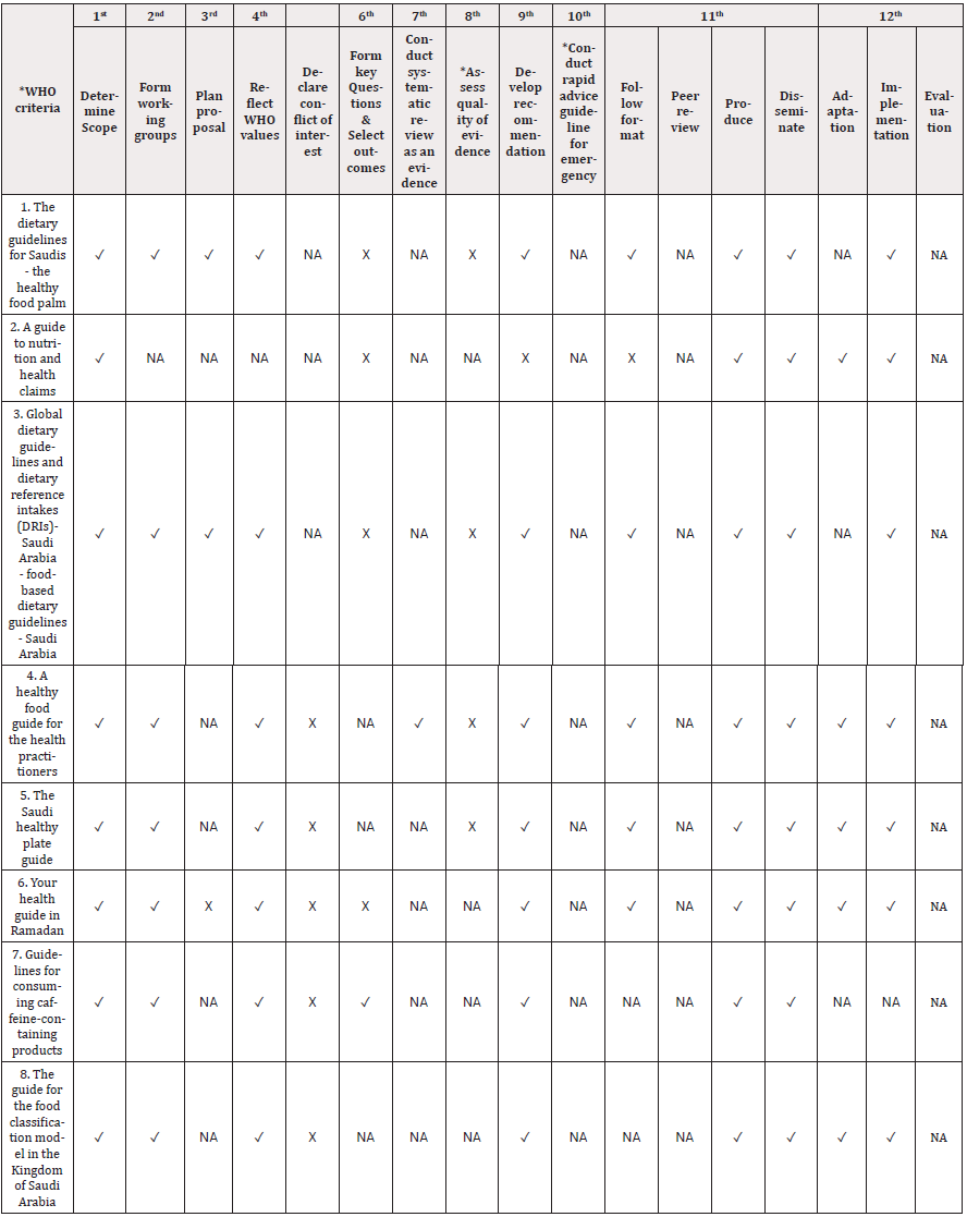 In general, the 12 WHO criteria are a form of guidance; therefore, not all criteria were covered by countries that were developing FBDGs, and no country worldwide covered all the 12 criteria. Usually, each country modifies its FBDG according to the available resources required to meet specific criteria. Both national and international FBDGs attempted to match almost all WHO guideline criteria and chose the best and most suitable criteria for adoption. The findings show that most national guidelines cover some of the 12 WHO criteria, such as declaring a conflict of interest, conducting a systematic review as evidence, peer reviewing the guidelines, and evaluating the guidelines. Moreover, the “evaluation” criteria are not undertaken in any of the national FBDGs. Evaluation is critical for policymakers to ensure that the guide’s aim is achieved and that it is appropriate for all groups. Therefore, national guidelines are usually presented by the government, which evaluates the guidelines as part of the internal process before publishing, and the evaluation criteria typically do not consider them as part of the internal process. Moreover, the evaluation of FBDGs by individuals before publication is important for greater accuracy. Currently, there is a national platform in SA for public consultation (a public consultation platform) to evaluate the guidelines before publication.
