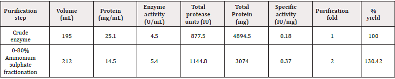 The purification steps, protein concentration, specific activity and yield of bromelain protease are shown in Table 2. The specific activity and purification fold were 0.37IU/mg protein and 2, respectively, when 0-80% ammonium sulphate used Table 2.