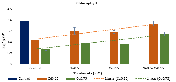 Leaf chlorophyll content was reduced up to 44.58% (Cd0.25mM) and 64.74% (Cd0.75mM) with Cd in comparison to control. The pigment loss remained at 23.43% (Cd0.25) and 52.62% (Cd0.75mM) with added SA0.5mM; and at 25.76% (Cd0.25mM) and 53.55% (Cd0.75mM) with Ca0.75mM. Their combination (SA0.5+Ca0.75) treatment has restricted the loss of chlorophyll to 5.98% (Cd0.25mM) and 30.2% (Cd0.75mM) (Figure 1).