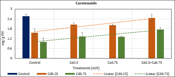 Figure 2: Effect of Cd alone and in combination with SA and Ca on carotenoids in chickpea plants. Each value represents the mean ± SE of three replicates. Mean difference is significant at P≤0.05 (LSD0.05=0.58).