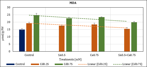 Malondialdehyde content of Cd stressed chickpea leaves has increased up to 29.02% (Cd0.25mM) and 65.66% (Cd0.75mM) in comparison to control. Its level remained higher than of control i.e., up to 17.09% (Cd0.25) and 51.14% (Cd0.75) with added SA0.5mM; and up to 23.41% (Cd0.25) and 56.17% (Cd0.75) with added Ca0.75mM. In their combined (SA+Ca) application the content increase was 3.44% (Cd0.25) and 33.04% (Cd0.75) (Figure 4).