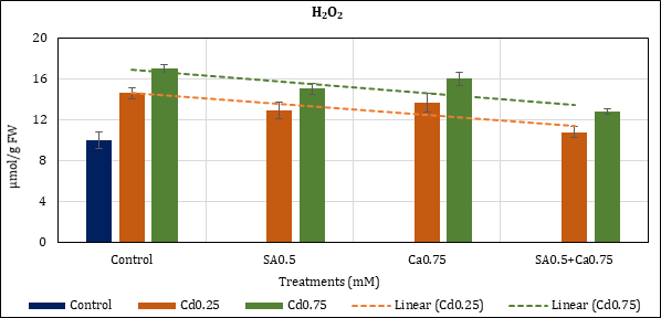 Figure 5: Effect of Cd alone and in combination with SA and Ca on H2O2 content in chickpea plants. Each value represents the mean ± SE of three replicates. Mean difference is significant at P≤0.05 (LSD0.05=2.21).