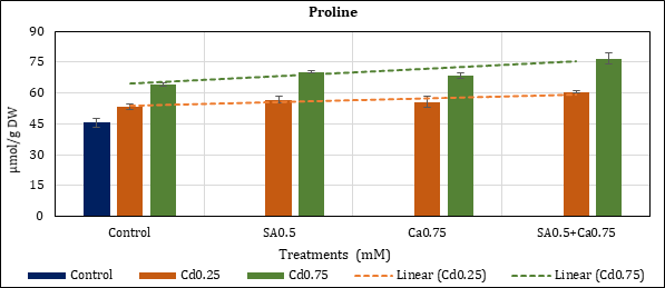 Accumulated contents of the osmolyte went up to 17.2% (Cd0.25mM) and 41.09% (Cd0.75mM) in Cd stressed chickpea in comparison to control (45.64 μmol). Their rise in SA0.5mM added treatment was 24.48% (Cd0.25) and 53.67% (Cd0.75mM); and in Ca0.75mM 21.9% (Cd0.25) and 50.12% (Cd0.75). The corresponding rise of proline in combined (SA0.5+Ca0.75 mM) Cd treatments remained at 32.31% (Cd0.25) and 68.41% (Cd0.75mM) (Figure 6).