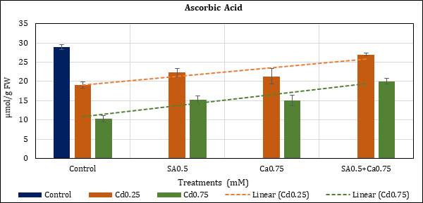 AsA content of the leaves dropped up to 33.85% (Cd0.25) and 64.11% (Cd0.75) with Cd in comparison to control. The loss with Cd added supplements remained at 22.86% (Cd0.25+SA0.5mM), 47.15% (Cd0.75+SA0.5mM), 26.23% (Cd0.25+Ca0.75mM), and 47.97% (Cd0.75+- Ca0.75mM). In the combined treatment (SA0.5+Ca0.75mM) loss of contents was checked to 6.74% (Cd0.25) and 30.59% (Cd0.75) (Figure 7).