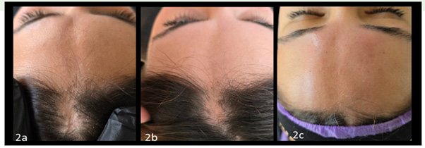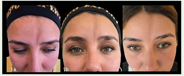 Figure 1: 1a, 1b, 1c: Depressed underlying frontal region in the supra and superciliary areas adjacent to the facial midline prior to treatment. Figure 1b illustrates the response following the initial session of the protocol. Figure 1c displays the outcome achieved in the second session of the hybrid protocol.