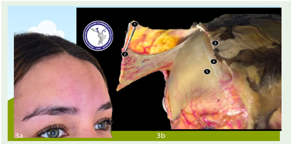 Figure 3: 3a Outcome following three sessions in the frontal region treated in planes 3, 4, and 5 as indicated in Figure 3b. Figure 3b: n1 Superficial fat, n2 Fibers of the frontal muscle and deep fascia, n3 Skin, n4 Periosteum, n5 Bone tissue. Planimetric design on a cadaver utilizing the Adipostructuring technique and PDO threads. (Image courtesy of CLEMI Foundation).