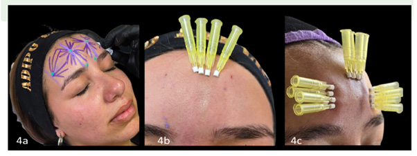 “Commence the initial session of Adipostructuring on 10/13/2024, followed by the second session on 10/28/2024 and the third session on 12/17/2024. Facial fat is a highly compartmentalized tissue, rather than a confluent mass delineated by vascularized boundaries [15,16]. The technique necessitates a comprehensive analysis of the affected area to be treated in the upper third of the face, specifically in the frontal region. With the adipostructuring technique, treatment initiates in the upper third, addressing both the adipose pannicles and the interceptal spaces. Three sessions are conducted, with a 21-day interval between each. Utilizing the adipostructure kit serves as an alternative to restore anatomical and cellular order, enhance the frontal and ligamentous panniculopathic condition, and achieve the reestablishment of biological balance, thereby amplifying the aesthetic and functional outcomes anticipated by patients.”