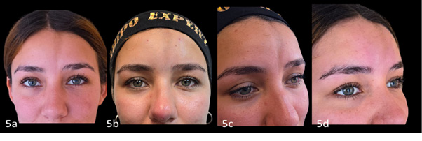 Figure 5a, 5b: Depressed underlying region in the supra- and superciliary zones adjacent to the frontal facial midline, observed before and after three sessions. Figure 5c, 5d: Depressed underlying region in the supra- and superciliary zones adjacent to the anteromedial facial midline, observed before and after a three- session protocol.