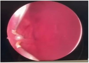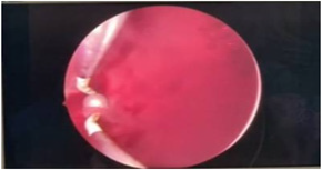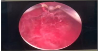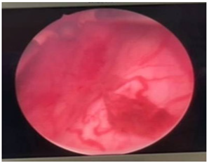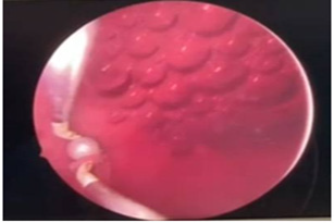 Cystoscopy was done to detect mucosa lesions in bladder; the whole mucosa was congested and red. There were multiple hemorrhagic areas in whole bladder mucosa; it was bled on touch. There was no focal ulcer or tumor. Therefore, generalized congested mucosa, hemorrhagic areas were probably due to DIC or CMV cystitis or candida cystitis or bacteria cystitis. The color of urine coming from Vescio-ureteric orifice of graft kidney was clear. Hemostasis was done with Ball electrode; bladder wash out was done with Tomey’s glass syringe. Figure 9-15 reveal cystoscopy findings. Abdominal tomogram was done; it revealed a swollen allograft kidney with air in the renal pelvis and renal vessels and subcapsular area suggestive of emphysematous allograft pyelonephritis. And, air along bladder wall was seen indicating emphysematous cystitis. They are illustrated in (Figure 16-19).