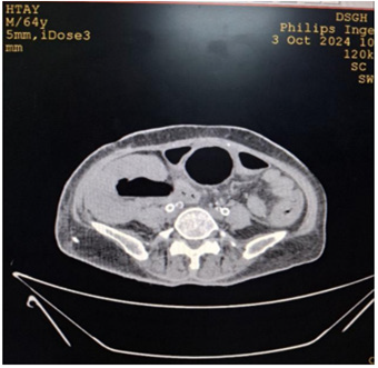Figure 16: CT abdomen axial view non-contrast showing swollen allograft kidney with air in the renal pelvic.