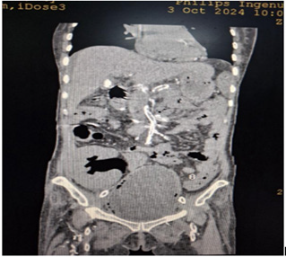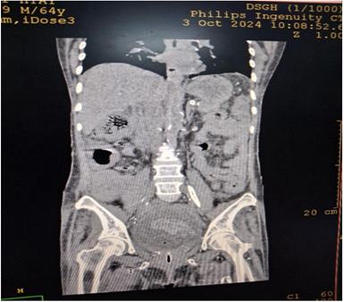 Figure 17: CT abdomen coronal view non-contrast showing swollen allograft kidney with air in the renal pelvic, subcapsular area and air along bladder wall.