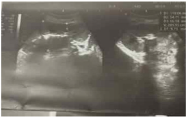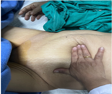 Figure 2: Distended bladder having 20-weeks-sized pregnancy due to blood clot obstruction at urethra (examination was done from left side as patient’s right side was stuck with drip stand).