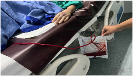 Despite treatment, the patient’s condition was still having fatigue and poor appetite. The patient was afebrile; no nausea; no diarrhea. Daily urine output was 1,000cc to 1,200cc; clear colorless. She developed frank hematuria on ‘Day 10’ after admission. And renal function dropped; serum creatinine rose to 4.3 mg/dL. Serum sodium was falling despite oral replacement (sodium 109mmol/L). On the other hand, hyperkalemia set in (potassium 5.53mmol/L). Hemoglobin decreased to 7.7g/dL; leukocytosis was increasing trend (Total WBC count 19.9×10⁹/L); platelet count fell to 48×10⁹/L. And, INR was sky high (INR 7.2). The features were suggestive of DIC; she had bruise at venipuncture site; severe anemia; and, she became drowsy and ill. She was pale; glossitis and stomatitis were present. And she had acute retention of urine due to clot obstruction. They are demonstrated in (Figure 1-4).