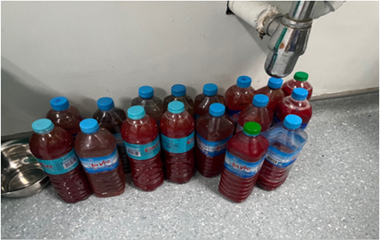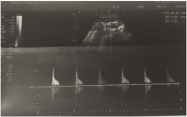 Liver enzymes continued to rise; ALT was 86 U/L; AST was 384.4 U/L; and, alkaline phosphatase was 256.2 U/L. Hematuria was massive amounting to hypovolemic shock; therefore, the patient was resuscitated with fluids and fresh blood. Figure 5-6 show hematuria in tube of indwelling urinary catheter, urinary bag and urine bottles. A total of 13 units of blood and blood products were transfused. Ultrasonogram was repeated; there were echogenic contents and septation in the urinary bladder; uterus was normal. The allograft kidney was 11X 5.X 6.6cm and cortical thickness was 9.7mm; it showed increased cortical echogenicity; corticomedullary junctions were preserved; echogenic foci with posterior shadowing were observed in the calyces; Resistive Indices (RI) became elevated (main renal artery was 0.87; segmental artery was 1.0; interlobar artery was 1.0). Native kidneys showed bilateral nephropathy with upper pole renal cyst in right kidney. Figure 7-8 demonstrate ultrasonographic findings.