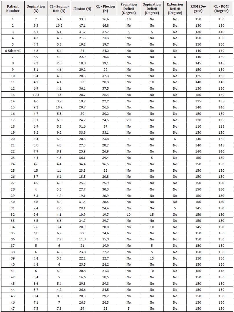 Note*: SD - Standard Deviation; N - Newton (strength); VAS - Visual Analogue Scale; MEPS - Mayo Elbow Performance Score with p evaluated by Mann-Whitney test for quantitative variables and Qui-Square Test for qualitative variables.