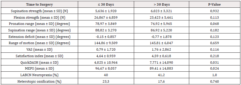 The overall complication rate was 52%: 10 patients had Heterotopic Ossification (HO) and 20 patients reported LABCN neuropraxia; one had both complications. All patients who presented HO were asymptomatic and no range of motion restriction was noted. Those who reported LABCN neuropraxia had full recovery, with all but one referring no significant impairment on daily activities. The occurrence of any complication did not affect VAS (p=0,488), overall satisfaction (p=0,786), Quick DASH (p=0,356) and Mayo Elbow (p=0,177) scores (Table 3). Comparison between patients who underwent surgery ≤ 30 days since injury (39 patients, 40 elbows) and those whose surgery was undertaken > 30 days (17 patients) after the injury is presented on table 4. A statistically significant difference regarding QuickDash (4,0 vs. 7,8) and MEPS (96,7 vs. 89,4), with better outcomes for patients treated earlier, was verified (p=0,031 and p=0,024, respectively). No statistically difference was found concerning HO or neuropraxia occurrence, impaired range of motion or strength, and VAS and satisfaction scores.