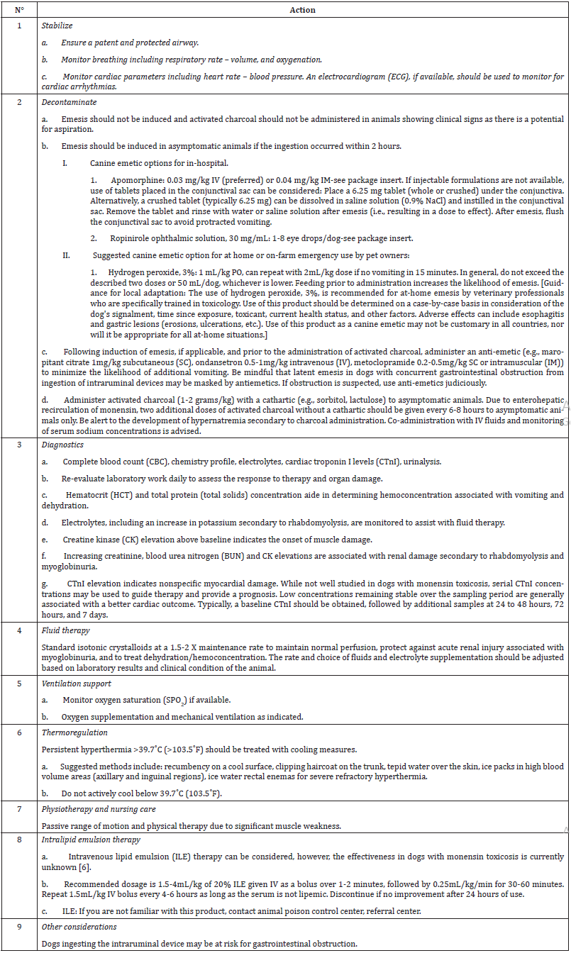 Specific treatment advice following monensin toxicosis consists of specific steps, as given in Table 1.