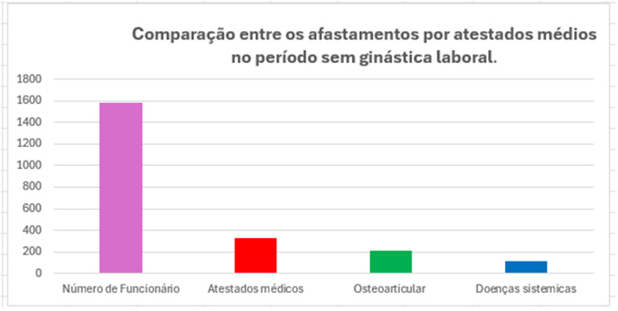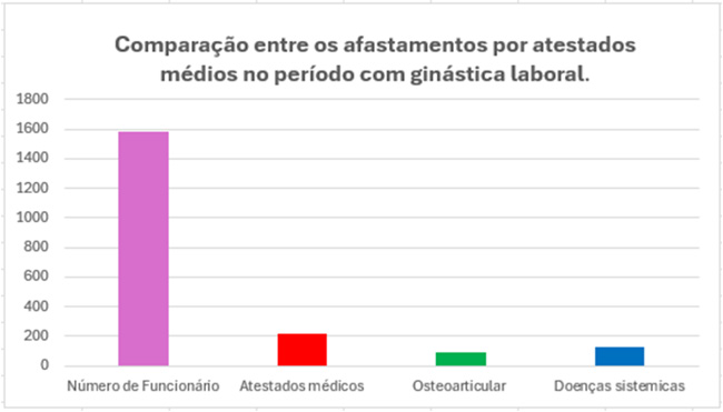 Results: It can be seen that in the period without gymnastics, absences due to medical certificates accounted for 354 certificates, while in the period with gymnastics there were 206, a reduction of 40.23%. As for systemic illnesses, there was a 19.28% reduction in sick leave after the gymnastics program was implemented. When analyzing musculoskeletal disorders, we found that in the first period there were 195 certificates, and in the second there was a reduction of 49.56%, to 98 certificates.