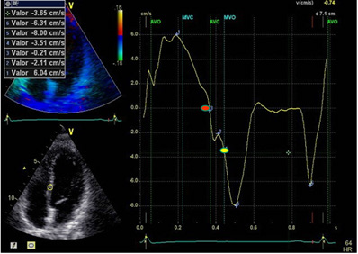 Patients provided their informed consent for this study and the investigation was previously approved by the Ethics Committee. All patients were in sinus rhythm with electrocardiograms that showed no abnormality. They were studied with Doppler echocardiography (Vivid IQ Premium ultrasound system). The variables analyzed were: Cardiac cycle (ms); Left ventricular systole (ms), LVPPMC (ms); Left ventricular diastole (ms); Relative Wall Thickness (RWT) (%); Left Ventricular Mass (LVM) (gr/m2); E/E’ ratio; LVFey (%); Left Atrial Volume (LAV) (ml/m2); Pulmonary Artery Pressure (PAP)(mmHg) and End-systolic volume (ml).