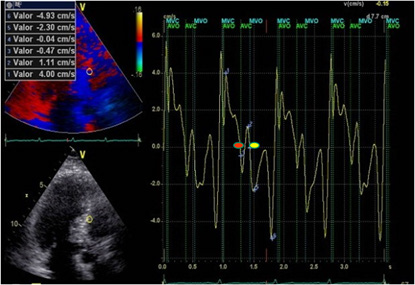 A significant increase of LVPPMC time was found in Group III patients with HFpEF compared with the group without heart disease (Group I and II). Moreover, in these cases the tissue strain curve loses its sharp slope and becomes irregular needing a more prolonged time to generate the necessary pressure difference to open the mitral valve (Figure 1 and 2). This variable correlates with the E/E’ ratio, since in Group I this was 6,34±1,46 compared with Group II that reached a value of 7,50±1,53 and the Group III which reached a value of 16.13±6.47 (p<0.01) (Table 1). An abnormal effect can be interpreted in the negative pressure generated in this phase, evidencing a delayed process with longer time to open the mitral valve [7] (Figure 1 and 2). We also observed that the diastolic duration (passive filling phase without energy consumption) was maintained with scant variation in all groups (354ms in the Group I; 471ms in the Group II and 333ms in the Group III), confirming that the altered suction mechanism occurring in the LVPPMC mainly participates of the dysfunctional process. The increase in LVM, RWT and VAI in Group III, all with significance, are measurements that correspond to an increase in PAP to 32mmHg in Group III in relation to Groups I and II of 22mmHg. These concepts would explain why in HFpFE a pulmonary wedge pressure ≥15 mmHg or a left ventricular end-diastolic pressure ≥16 mmHg is usually found [8]. The possible interpretation is that as the LV mass increases it does not reach suitable detorsion in a normal time to generate a drop in pressure with adequate slope to open the mitral valve.