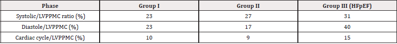Results: In Group III: left ventricular mass, E/E´ ratio and left atrial volume were significant. Regarding the total duration of the cardiac cycle, systole and diastole, the cohorts were baseline equal except for the left ventricular suction time which was longer in patients with heart failure with preserved ejection fraction.