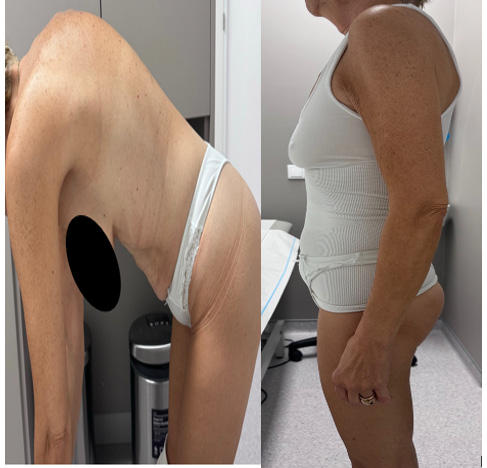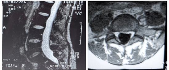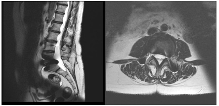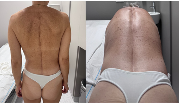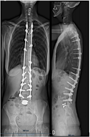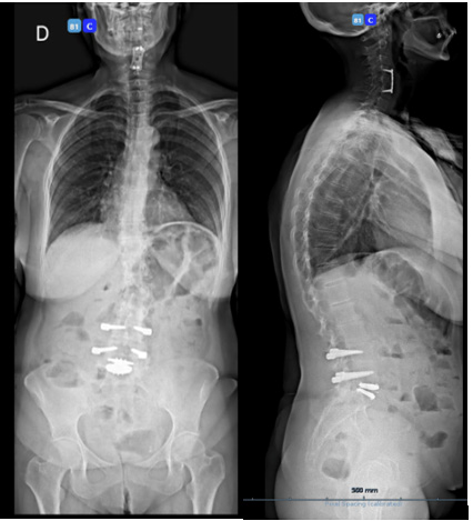 We present the case of a 40-year-old woman who presented with low back pain resistant to analgesics and rehabilitation. She was compensated and had excellent flexion and extension of her spine. The patient had a normal neurologic examination of the lower extremities. Radiographic evaluation revealed good sagittal and coronal balance, despite the co-existing mild thoracolumbar scoliosis. MRI showed Degenerative Disc Disease (DDD) at L4-L5 and L5-S1 (Figure 1A-B). She underwent a lumbar Total Disc Replacement (TDR) at L5–S1with the Charité III prosthesis and Posterior Transpedicular Dynamic Stabilization (PDS) with the Dynesys system at L4-L5 in 2001. Post-operatively, there was significant clinical improvement and the patient went back to work. In 2014, the patient complained of unremitting axial low back pain, aggravated by walking and sitting with increasing difficulty standing and looking straight ahead when walking. Concurrently, polyarthralgia and throcanteritis were also present. This motivated evaluation by Rheumatology for autoimmune disease screening which was negative. Despite being subjected to a new rehabilitation protocol, there was no clinical improvement. X rays showed a degenerative scoliosis with sagittal and coronal imbalance (Figure 2A-B) with multiple discopathies and syndesmophytes through the lumbar and thoracic spine. TDR and PDS were stable and in good position. MRI showed Dark Disc Disease at D11-D12 and from L1-L2 to L4- L5 (Figure 3A-B). The patient underwent a Transforaminal Lumbar Interbody Fusion (TLIF) at L3-L4, PDS removal and T4-L5 posterior fusion in November 2018. At the moment, the patient maintains reported significant improvement in her back pain and reduction in the requirement of analgesic medicines. Physical exam shows good spinopelvic mobility (Figure 4). Radiographs reveal good coronal and sagittal balance and satisfactory position of the total disc replacement and good fusion of the thoracic and lumbar spine proximally (Figure 5A-B) (Figure 6A-B).