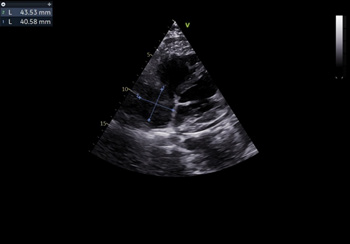 Figure 1: Two-dimensional transthoracic echocardiographic subcostal four chamber view showing mass in the right atrium measuring 4.3 X 4.0cms.