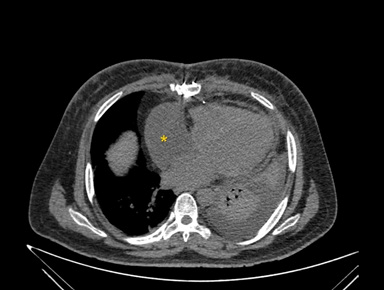 Figure 3: Computerized tomographic axial view of right atrial extra cardiac collection indicated by yellow asterisk (*).