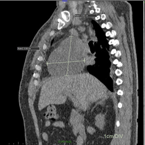 Figure 4: Computerized tomographic sagittal view of right atrial extra cardiac collection of 8.8 x 8.0 cms.