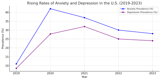 The COVID-19 pandemic has left an indelible mark on the mental health landscape in the United States, with significant increases in the prevalence of anxiety, depression, and burnout. Data from the Centers for Disease Control and Prevention (CDC) highlights that during the height of the pandemic, 42% of adults reported symptoms of anxiety or depressive disorders, compared to just 11% in 2019 [1]. Similarly, a study published in JAMA identified that the prevalence of depression in the U.S. tripled during the pandemic, with rates increasing from 8.5% pre-pandemic to 27.8% in 2020 [2]. Burnout, particularly among healthcare workers, also surged. According to a 2022 report by the American Medical Association, 62.8% of physicians reported experiencing burnout, a sharp increase from 38.2% in 2020, reflecting the immense strain placed on frontline workers.