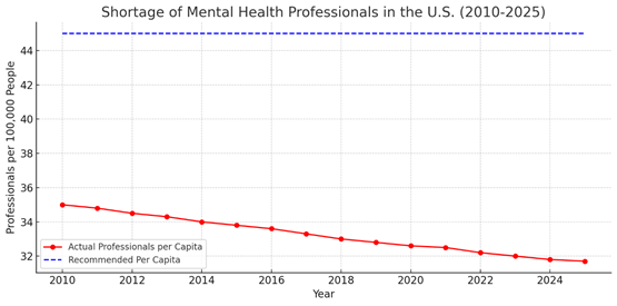 The ongoing mental health crisis in the United States has illuminated a critical shortage of qualified mental health professionals. According to a report from the Health Resources and Services Administration (HRSA), approximately 111 million Americans live in areas designated as Mental Health Professional Shortage Areas (HPSAs) [7]. This shortage significantly limits access to care, particularly in rural and underserved urban communities where mental health needs are often the greatest. This is buttressed more in Figure 2, where there is a sustained decline of mental health professionals against the required per capita. To address this gap, there is an urgent need to expand training programs and offer incentives for individuals entering the mental health field.