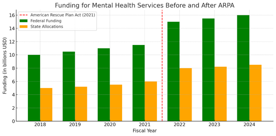 One effective approach is to enhance educational pipelines for mental health professionals, such as psychologists, social workers, and counselors. By increasing funding for graduate programs and offering scholarships or loan forgiveness programs for students who commit to working in underserved areas, we can encourage more individuals to pursue careers in mental health. For instance, the National Health Service Corps (NHSC) has demonstrated success by providing loan repayment assistance to healthcare providers, including mental health professionals, who serve in HPSAs [8]. Additionally, telehealth advancements have created opportunities for training in remote service delivery, expanding the skill sets of mental health professionals to meet the needs of a broader patient population. Hence, Figure 3 highlights the critical impact of the American Rescue Plan Act on funding trends for mental health services, yet it would benefit from specifying the time frame and quantifying the changes in funding to provide a clearer context for the observed trends. In conjunction with workforce enhancements, policy, and funding reforms are crucial to creating a sustainable mental health care system. Increasing federal and state funding for mental health services is essential for expanding access and improving the quality of care. The National Alliance on Mental Illness (NAMI) emphasizes that adequate funding can support community- based programs, crisis intervention services, and preventive care initiatives, which are vital for reducing the burden on emergency rooms and inpatient facilities [9]. Recent legislative efforts, such as the American Rescue Plan Act of 2021, allocated significant funds to expand mental health services, highlighting a growing recognition of mental health as a public health priority.