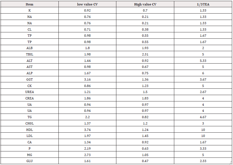 In conclusion, the intra-batch and intermediate precision of all 22 routine biochemical indicators were less than the corresponding standards, and the precision met the clinical needs.