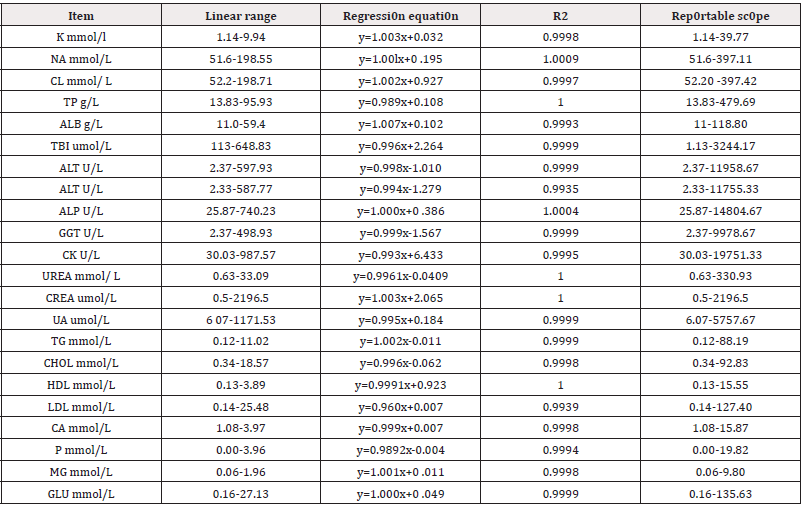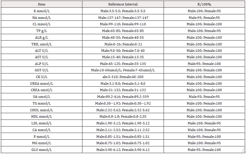 The results of correctness are shown in Table 1, and the maximum bias of all 22 routine biochemical items ranged from -3.91% to 4.34%, and the test bias of all 22 routine biochemical items were not more than half of the maximum deviation allowed by the WS/ T403 2012 standard, which sufficiently proved that their accuracy meets the requirements.