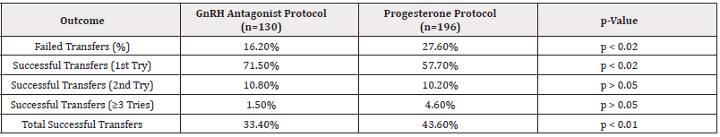 ii. Progesterone proved more effective in long-term outcomes, with overall successful transfers at 43.6% compared to 33.4% (p<0.01).