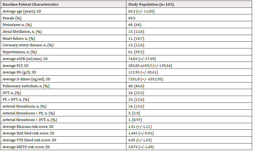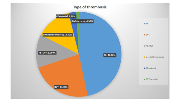 We included 103 patients-50 in the retrospective group and 53 in the prospective group and followed them up for 6 months. The average age of patients was 65,3 years. They were almost equally distributed by gender. Most of the patients had metastatic disease. Hypertension was observed in most of them. Anemia was prevalent among patients (Table 1). VTE is much more common than arterial events (Figure 1).