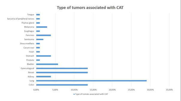 The largest proportion of CAT patients have lung cancer (30 people, 29,1%). The second place is divided between colon cancer (13,6%), breast cancer (13,6%) and carcinoma of the genital system (14 people, 13,6%). Bladder cancer takes third place (6 people, 5,8%). The next place is for kidney cancer (4 people, 3,9%), gastric cancer (3,9%) and pancreatic cancer (3,9 %). There are 3 patients with melanoma (2,9%). 2 patients have seminoma (1,94%). The rest of the tumors are one number each: prostate cancer (0,97%), heart cancer (0,97%), carcinoma of the cavum nasi (0,97%), sinus maxillaris (0,97%), esophagus (0,97%), thymus gland (0,97%), tongue (0,97%), and sarcoma of the periphery nerves (0,97%) (Figure 2).