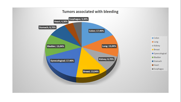 The most frequent tumors associated with bleeding events were colon cancer and gynecologic tumors (4 of 23 for each, 17,4%), the second place was divided between breast cancer, lung cancer, and bladder cancer (3 cases of each, 13,04%). Gastric and kidney cancer- 2 cases of bleeding for each, 8,7%. Tumors of the esophagus and the heart: 1 case for each, 4,3% (Figure 3). In most cases, the bleeding was from the GI tract, also there were a few cases of genitourinary bleeding and epistaxis (Table 4, Figure 4).