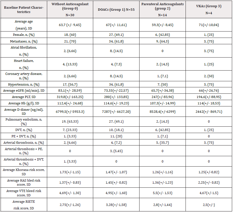 Anticoagulant therapy was initiated. The choice of anticoagulant was based on the patient’s baseline characteristics, age, Estimated Glomerular Filtration Rate (eGFR), Hemoglobin (Hb) and Platelet (Plt) levels, concomitant diseases, bleeding risk, the type and stage of the tumor, the presence of brain lesions, the patients’ preferences, etc. We divided the patients into four groups: a group who do not take anticoagulant therapy (called group 0, which includes 30 patients), a group with Direct Oral Anticoagulants (DOACs) (group 1, which includes 55 patients), a group on parenteral anticoagulants (group 2, which includes 14 patients), and a group of patients prescribed Vitamin K Antagonists (VKAs) (group 3, which includes 4 patients).