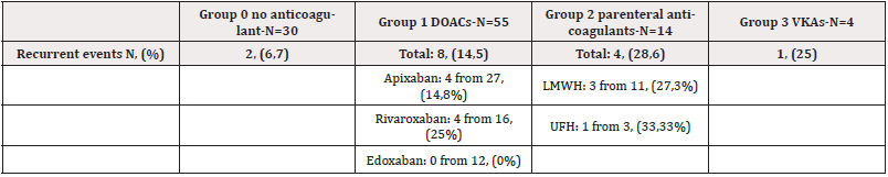 There were 15 cases of recurrent events (14,6% of the group). The recurrence rate was highest in the group 2 who were on parenteral anticoagulants- 28,6%. In the group who were on DOACs, recurrence was most common in patients on rivaroxaban (Table 5).